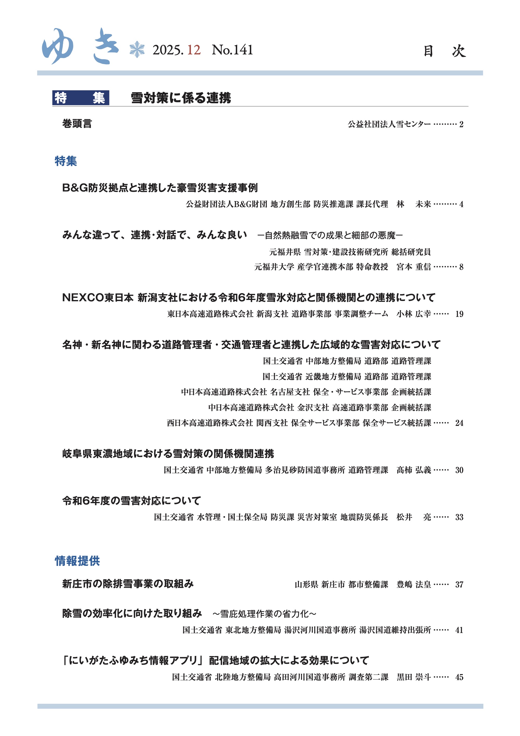 機関誌「ゆき」No.141 特集:雪対策に係る連携 令和7年12月12日発刊