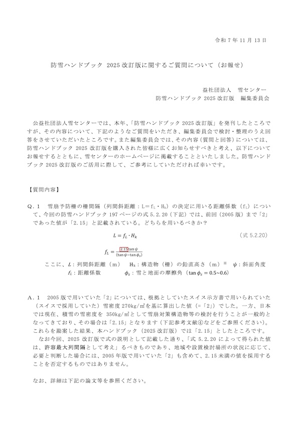 防雪ハンドブック2025改訂版に関するご質問について(お報せ)